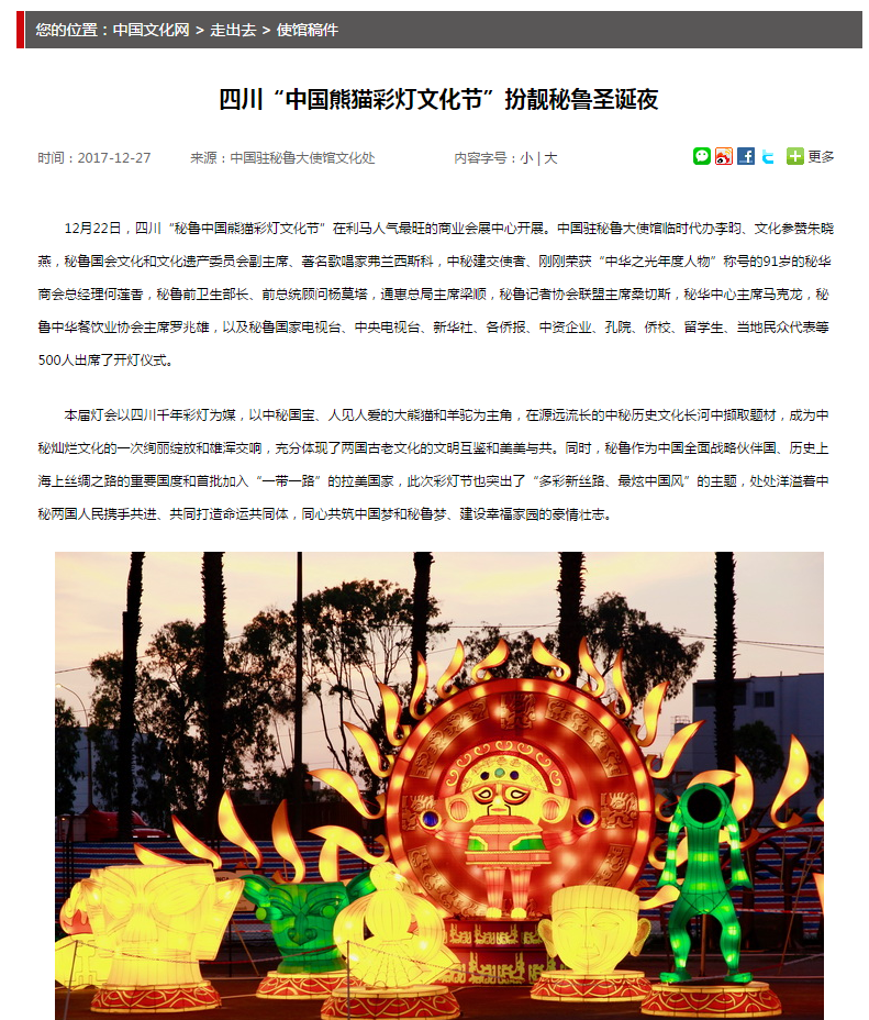 國家文化部官網專題報道:東方彩燈∣四川“中國熊貓彩燈文化節”扮靚秘魯圣誕夜