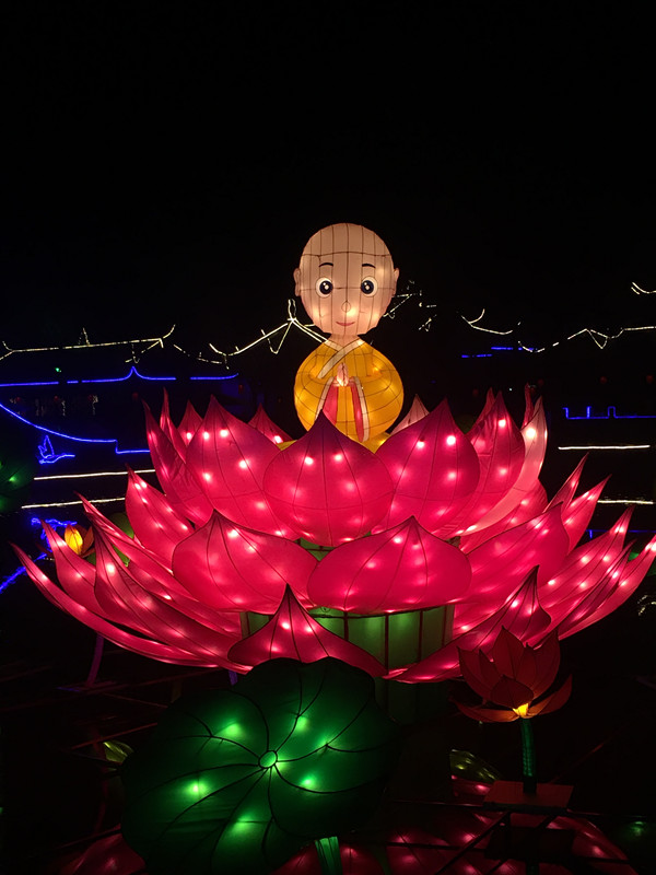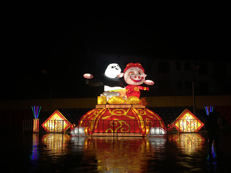《荷塘月色》、《和和滿滿》、《恭賀新春》、《錦鯉滿堂》、《蓮花童子》等新年主題燈組千姿百態、色彩斑斕,憨態可掬的國寶熊貓與吉祥“豬”牽手共同向人們拜年,