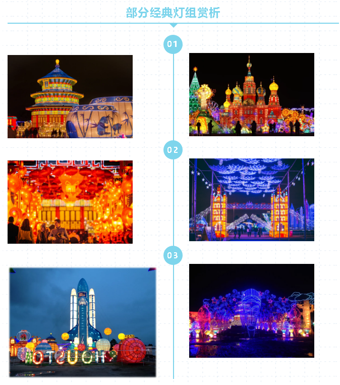 休斯敦“冬季夢幻彩燈嘉年華”分為“冬夢奇景”、“共同的世界”、“遠古的呼喚”、“東方之燈”等七大主題板塊,展出燈組數近200余組。