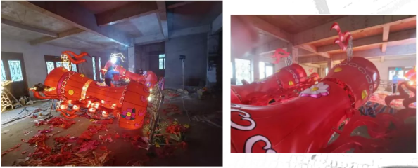 現場大多數的花燈還在按流程趕制中,也有一些已成型了。已經制作好的打鼓你能看出是哪一個花燈造型的嗎?