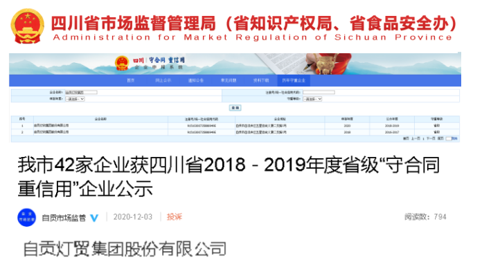 燈貿集團以良好的企業信譽和社會口碑,榮獲四川省市場監督局管理局頒布的2018-2019年度四川省“守合同重信用”企業稱號。