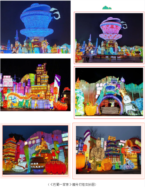 今年,自貢·中華彩燈大世界以“觀自貢燈 過中國年”為主題,550畝展區、十五大主題、上百組彩燈,給游客們帶來一場自貢彩燈文創新紀元的視覺盛宴。有800多年歷史的自貢燈會,開啟全新云時代,將自貢燈會打造成展現時代風貌的大舞臺,讓您足不出戶也能領略“天下第一燈”的魅力!由燈貿集團創意、設計團隊等數百名彩燈匠人歷時兩個多月精心打造的《巴蜀一家親》、《自貢記憶》、《五糧液》三個大型燈組?!栋褪褚患矣H》薈萃川渝各城風貌之靈光,主體以獨具特色的川渝茶文化代表——蓋碗茶為載體,現代透光材質制作憨態可掬的熊貓,下方高鐵環繞而行,輔以巴蜀特色元素,將自貢傳統彩燈制作工藝與新技術相結合,為游客帶來可看、可聽、可聞的沉浸式的觀燈體驗。