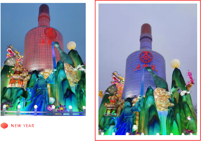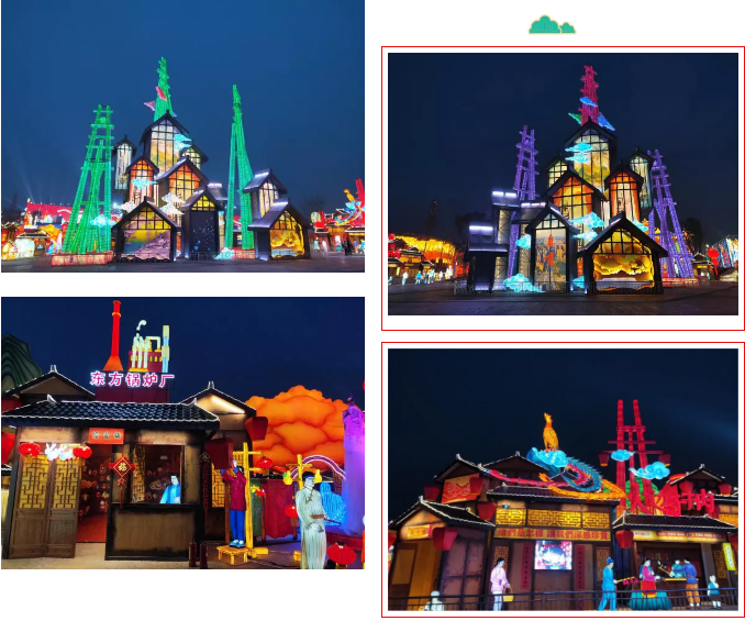 《自貢記憶》主燈組使用傳統材質結合現代工藝,宏偉的天車獨創性的使用啤酒瓶制作,配合追光變色形成絢麗奪目的燈光效果。顯示屏剪影式表現自貢元素??铸埓┬?、錦鯉游動,還有靈活靈現的自貢歷史場景和人物,還原了一幅原滋原味又生動的老自貢記憶。