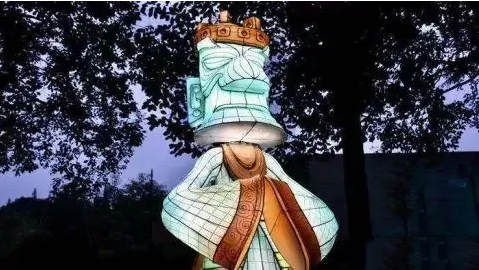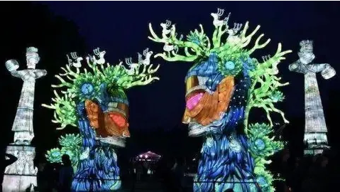 據(jù)自貢燈貿(mào)集團設(shè)計總監(jiān)陳潔介紹,在入口廣場處的燈組以青銅縱目面具為設(shè)計原型,作為三星堆“六大國寶”之一的青銅縱目面具,寬1.38米,高0.645米,眼睛呈柱狀向外凸,是館藏中形體最大的青銅面具。本燈組按比例還原青銅縱目面具,燈組高3.2米,寬3.4米。