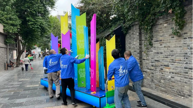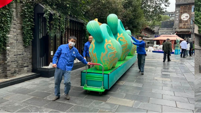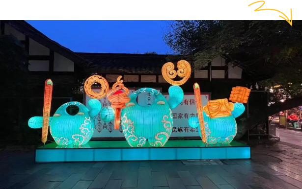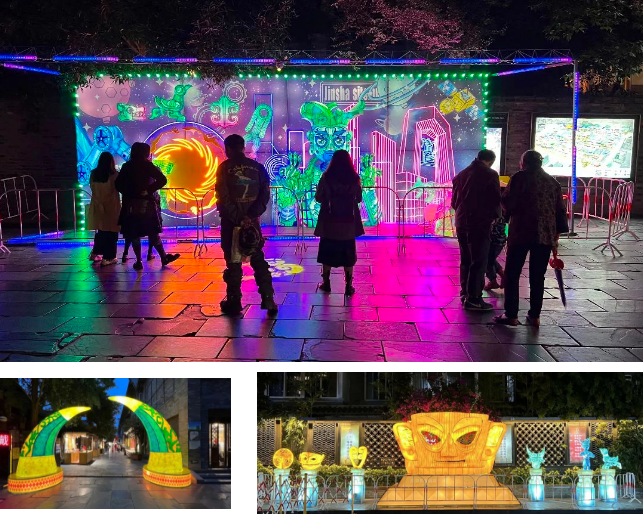 滿繪彩色圖案的金沙象牙燈組、文物造型設(shè)計(jì)燈組《嗚嚕嚕》,演繹著傳統(tǒng)文化的“國(guó)潮”新風(fēng)尚,彰顯著文創(chuàng)帶給這座城市的新鮮感和創(chuàng)造力。分布在寬窄巷子景區(qū)燈組,讓游客一腳踏入光影幻境中的古蜀王國(guó)。