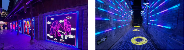 燈展還利用寬窄巷子獨(dú)特的建筑形式,在“寬徑”兩邊的墻壁上,用光雕、LED、互動(dòng)投影等形式打造了長(zhǎng)達(dá)80米的“時(shí)間長(zhǎng)廊”。隨著游客參觀的腳步,古蜀人祭祀、漁獵、制陶、冶金、治玉等生活片段如連環(huán)畫(huà)般漸次出現(xiàn)。