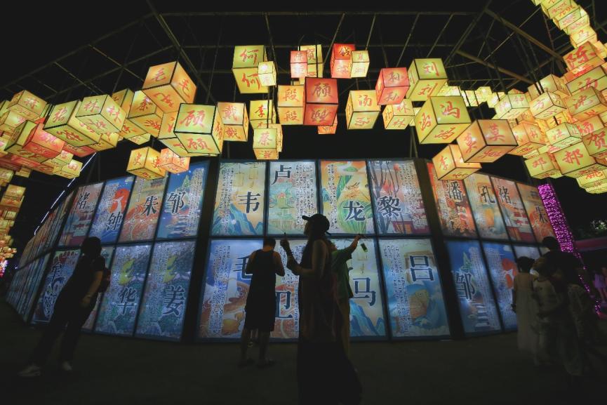 本次燈會刮起濃濃“國潮風”。燈會入口是一座中式建筑風格的迎賓門,長達50米的迎賓廊道掛滿燈籠,市民游客穿行其間,恍如置身漢唐;十二生肖彩燈俏皮靈動,精致絢爛;百余句經典詩詞點亮道旁樹木;百家姓燈籠組成長龍,中華傳統文化韻味十足。